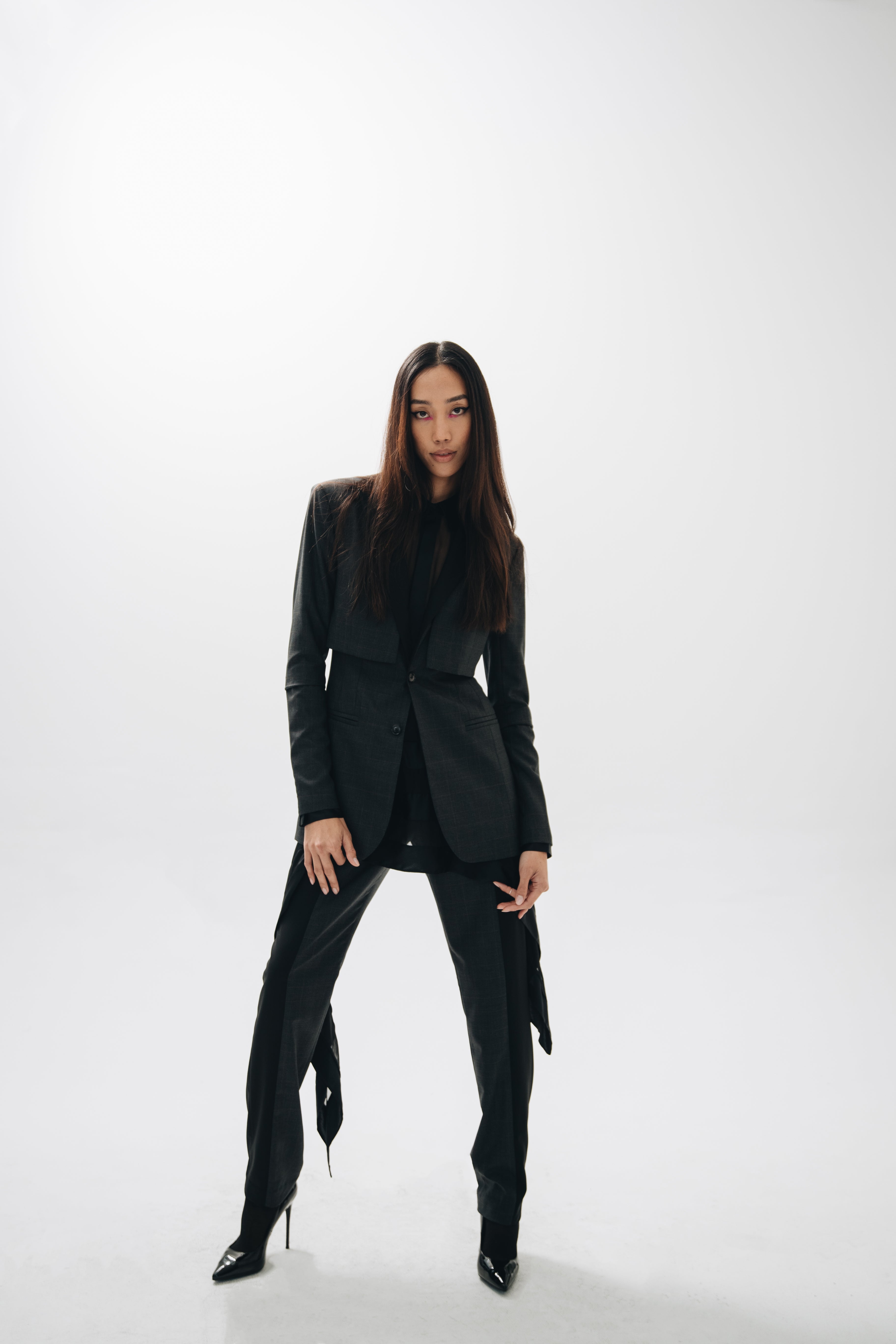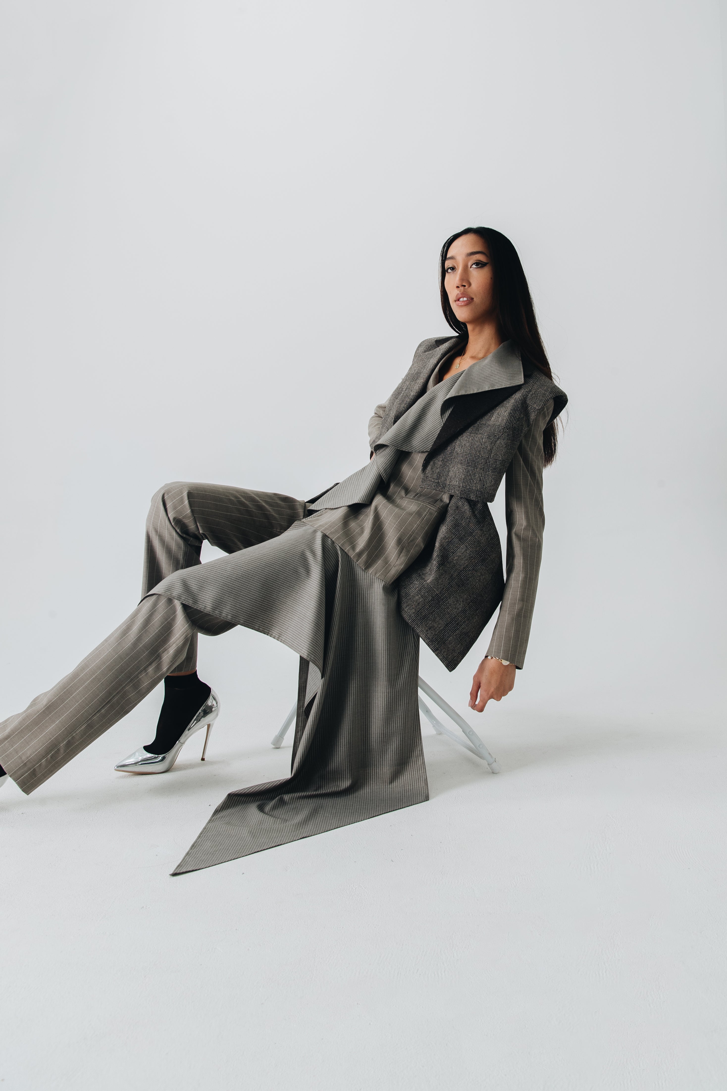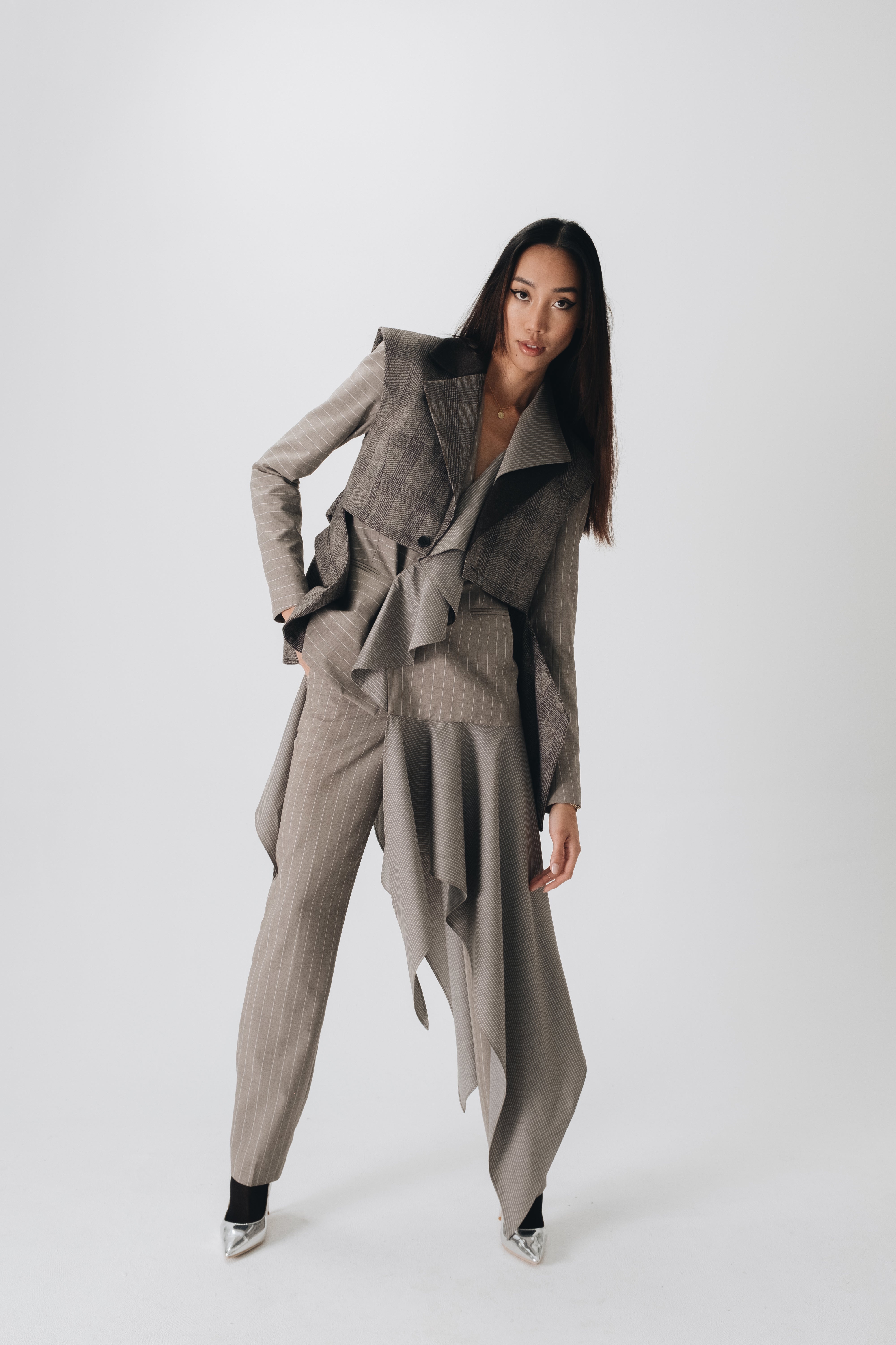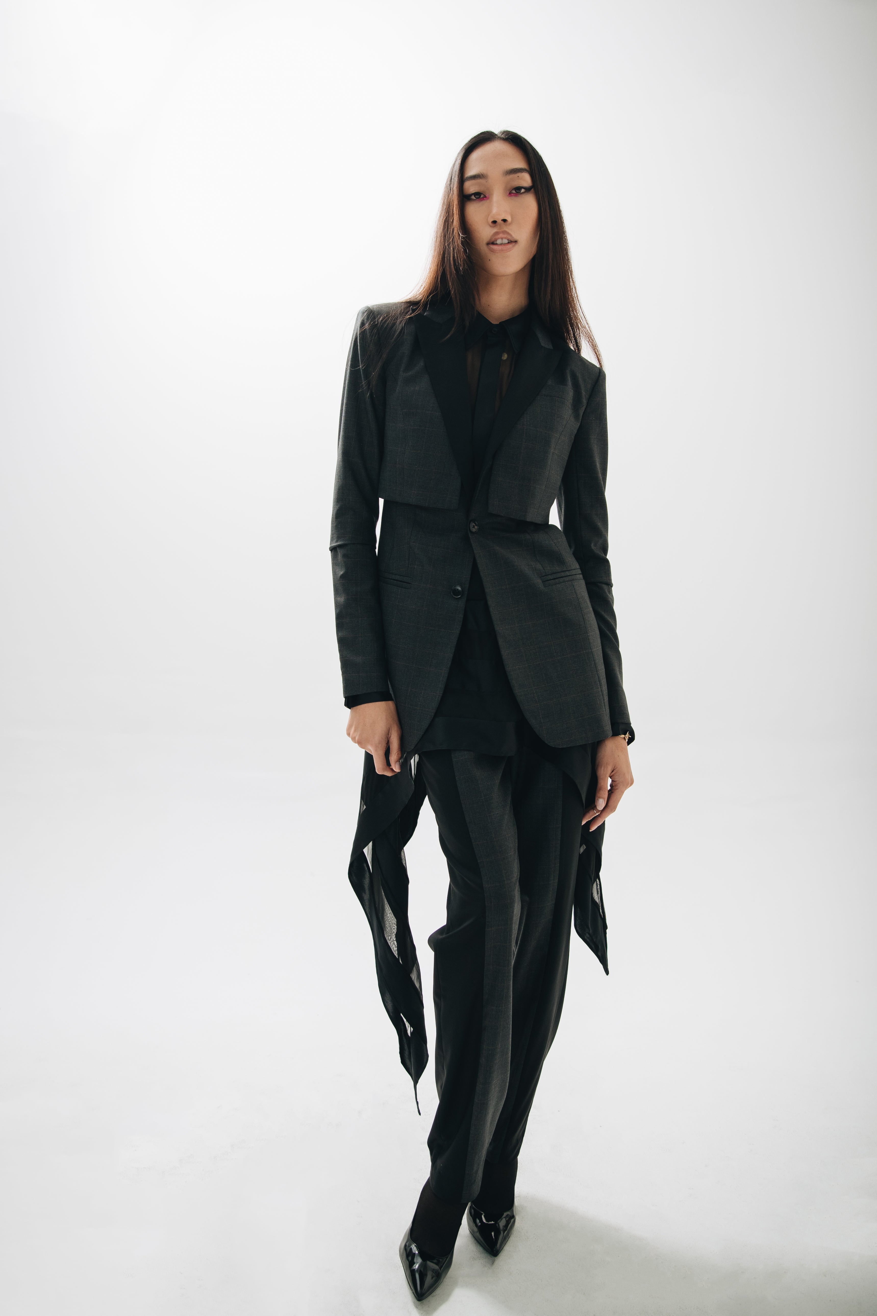 F.L.U.I.D. dismantles gender assumptions through maximalism and duality. Exaggerated suits, fluid jackets, architectural corsets, and evening gowns shift between opacity and vulnerability. Black, grey, blue—menswear fabrics meet silk. Garments become what the wearer demands. Vision over expectations.