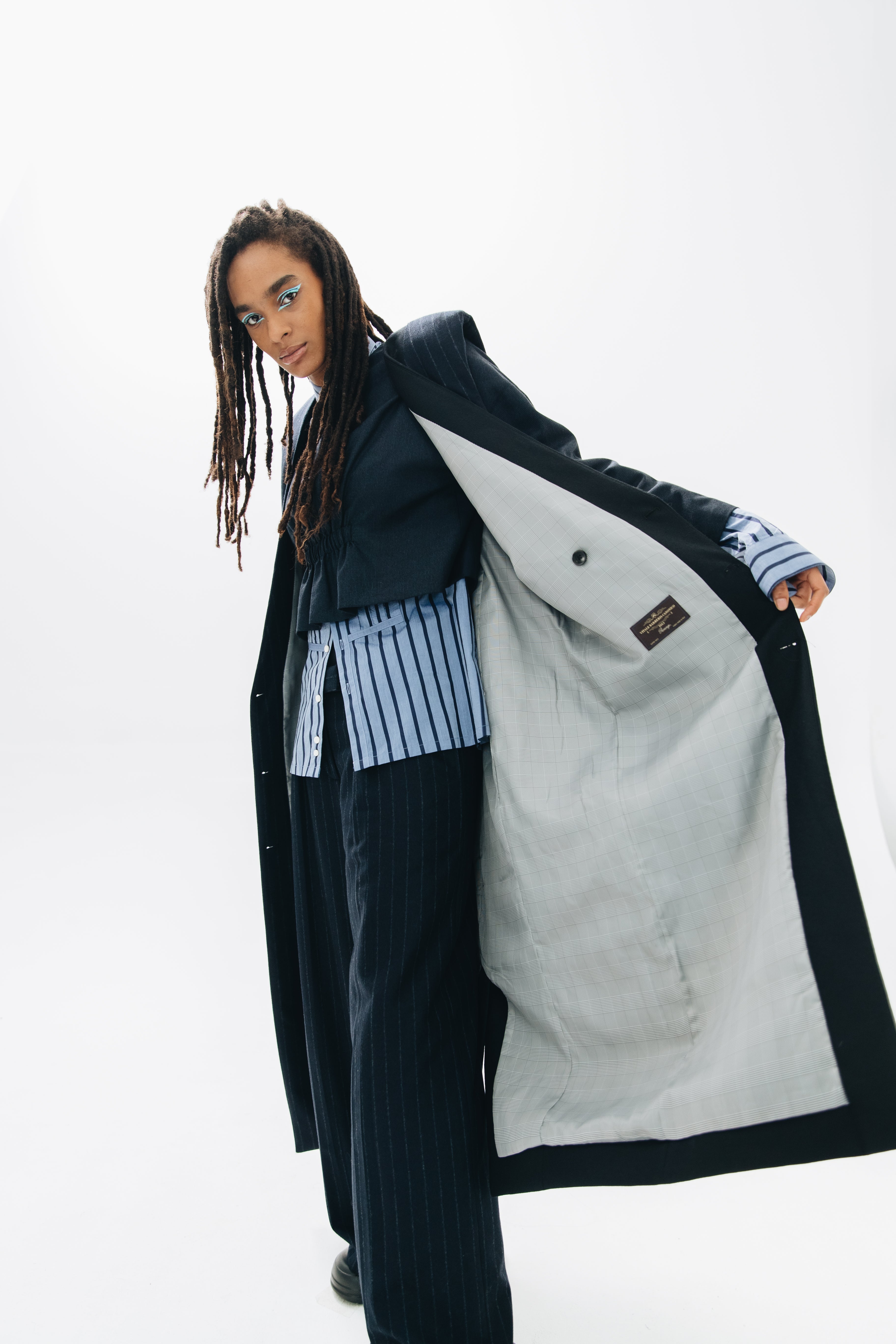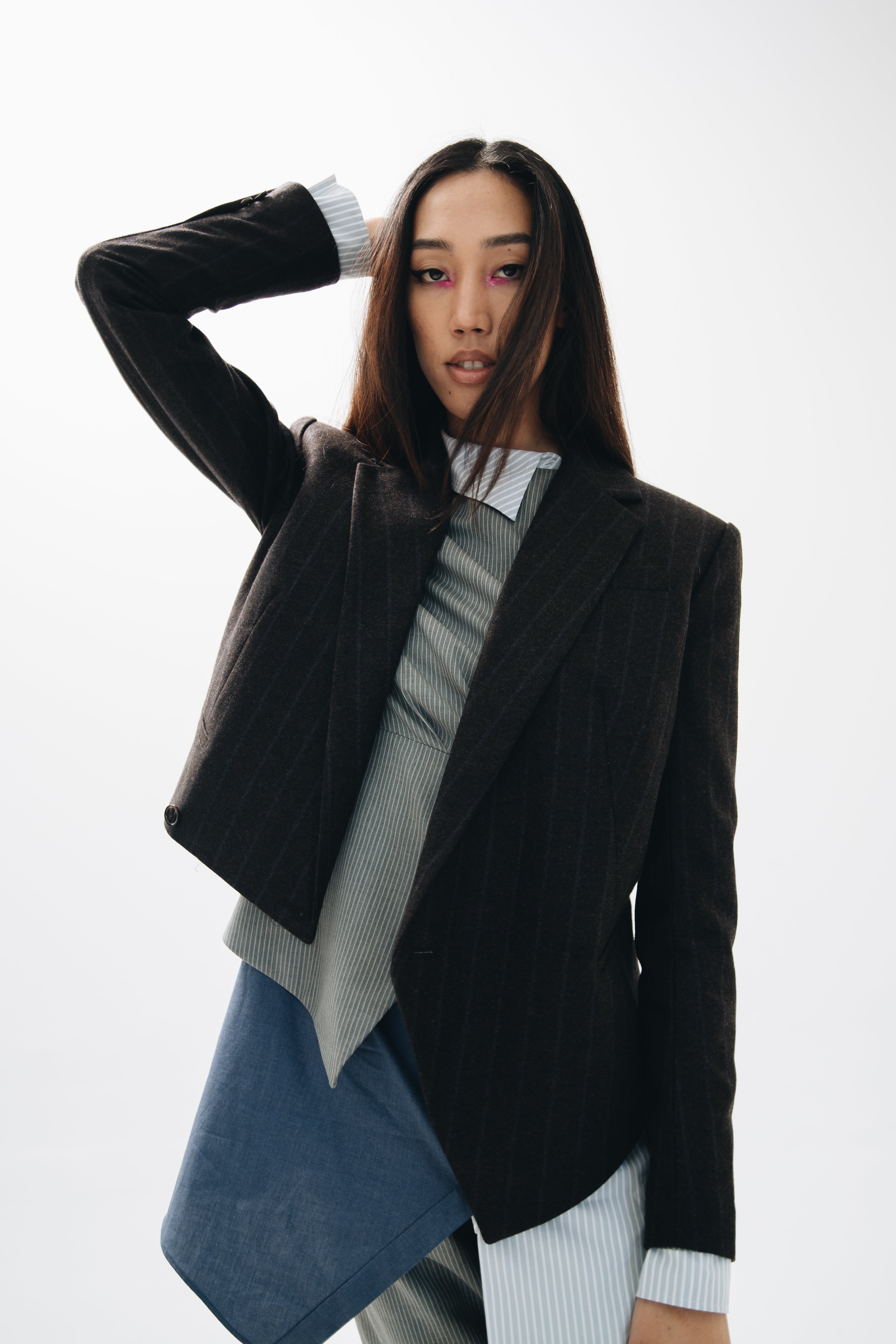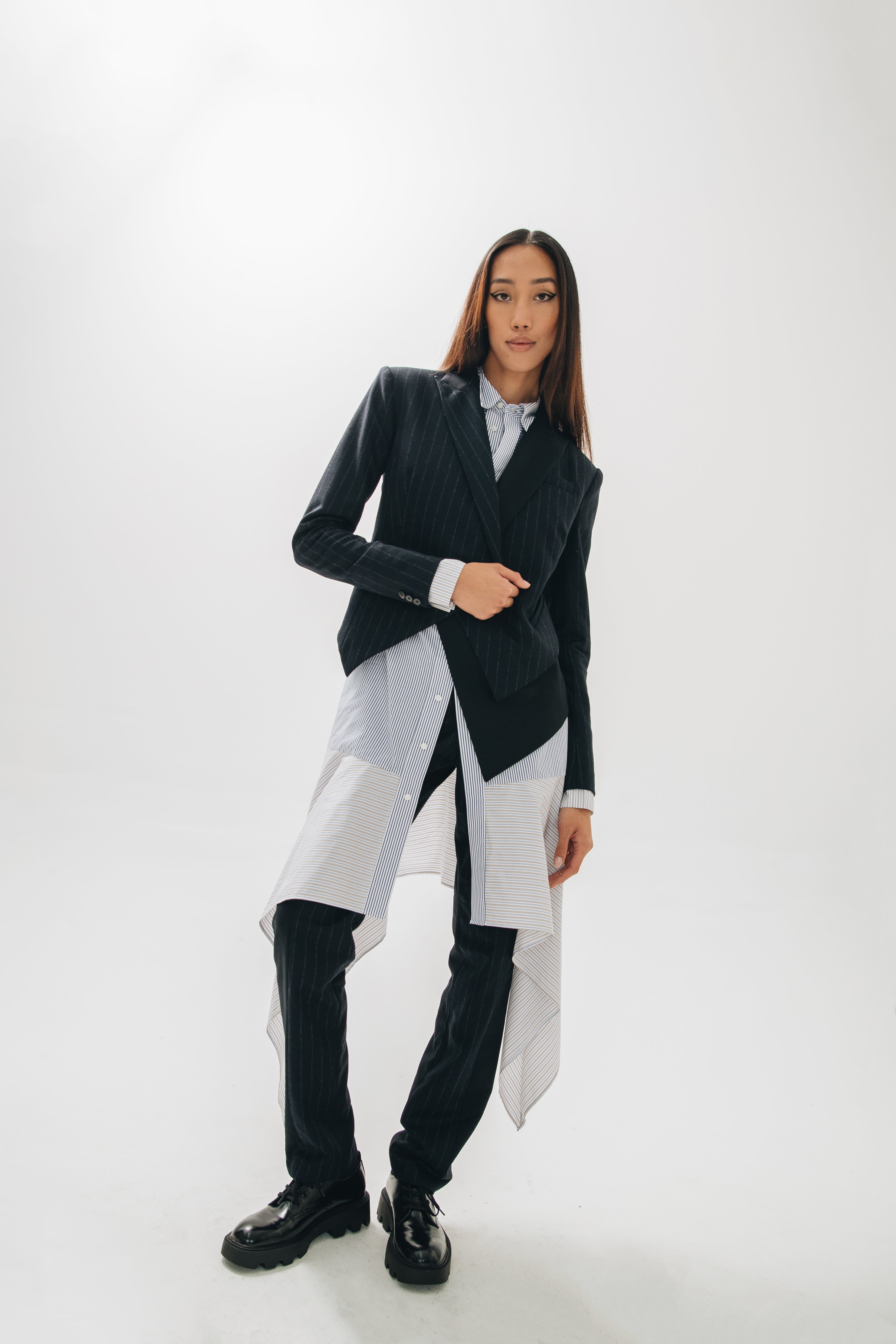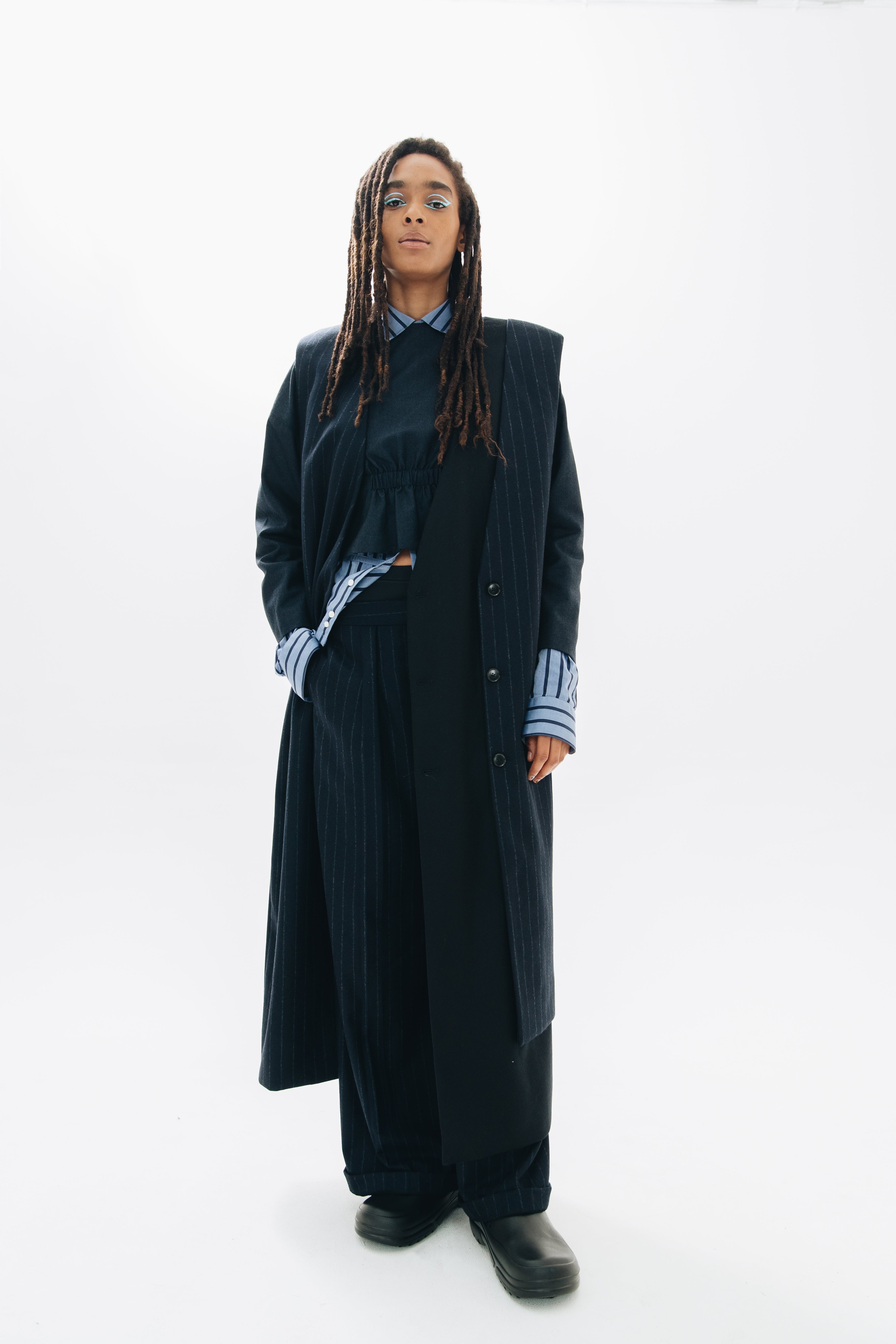 F.L.U.I.D. dismantles gender assumptions through maximalism and duality. Exaggerated suits, fluid jackets, architectural corsets, and evening gowns shift between opacity and vulnerability. Black, grey, blue—menswear fabrics meet silk. Garments become what the wearer demands. Vision over expectations.