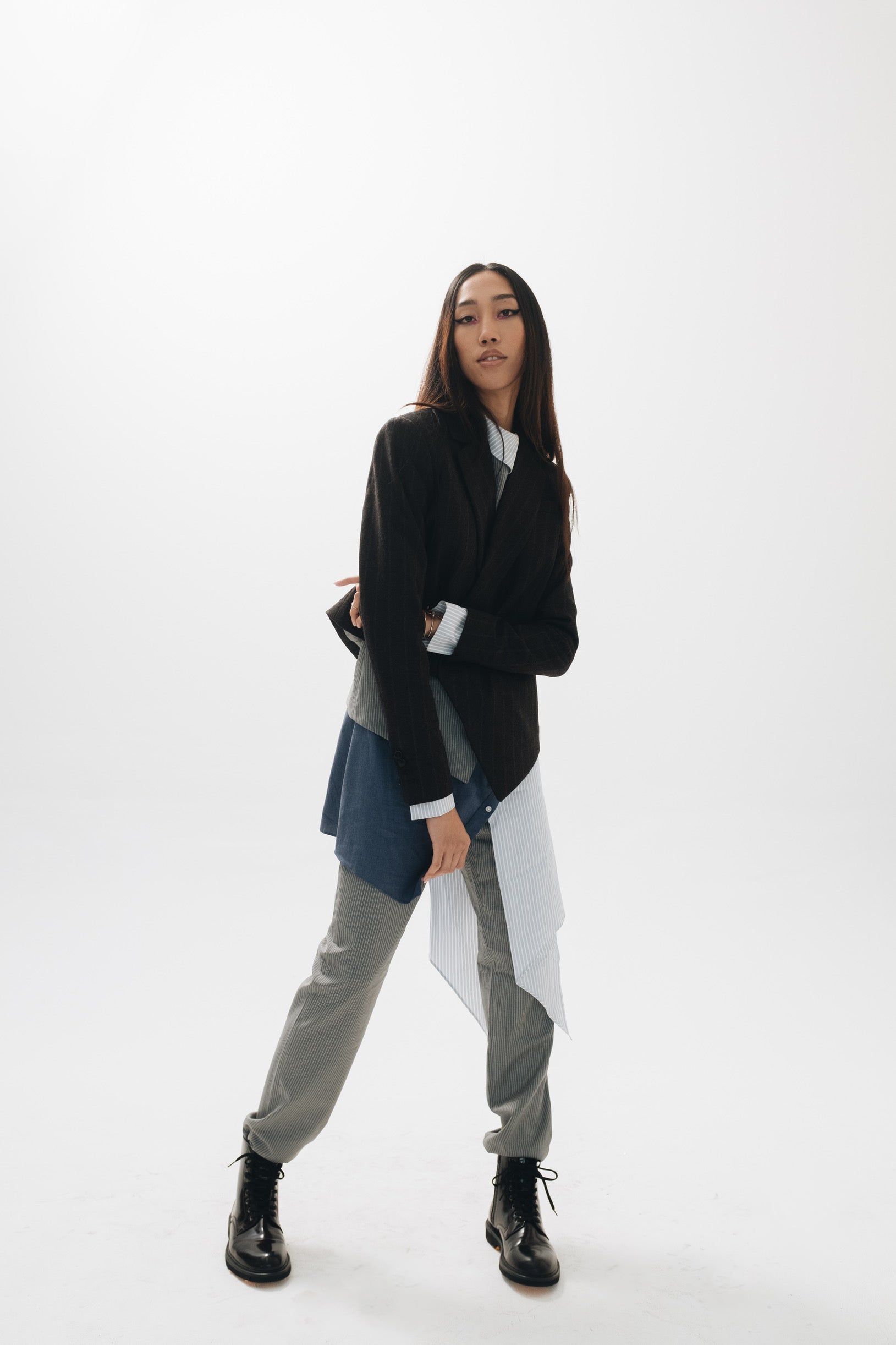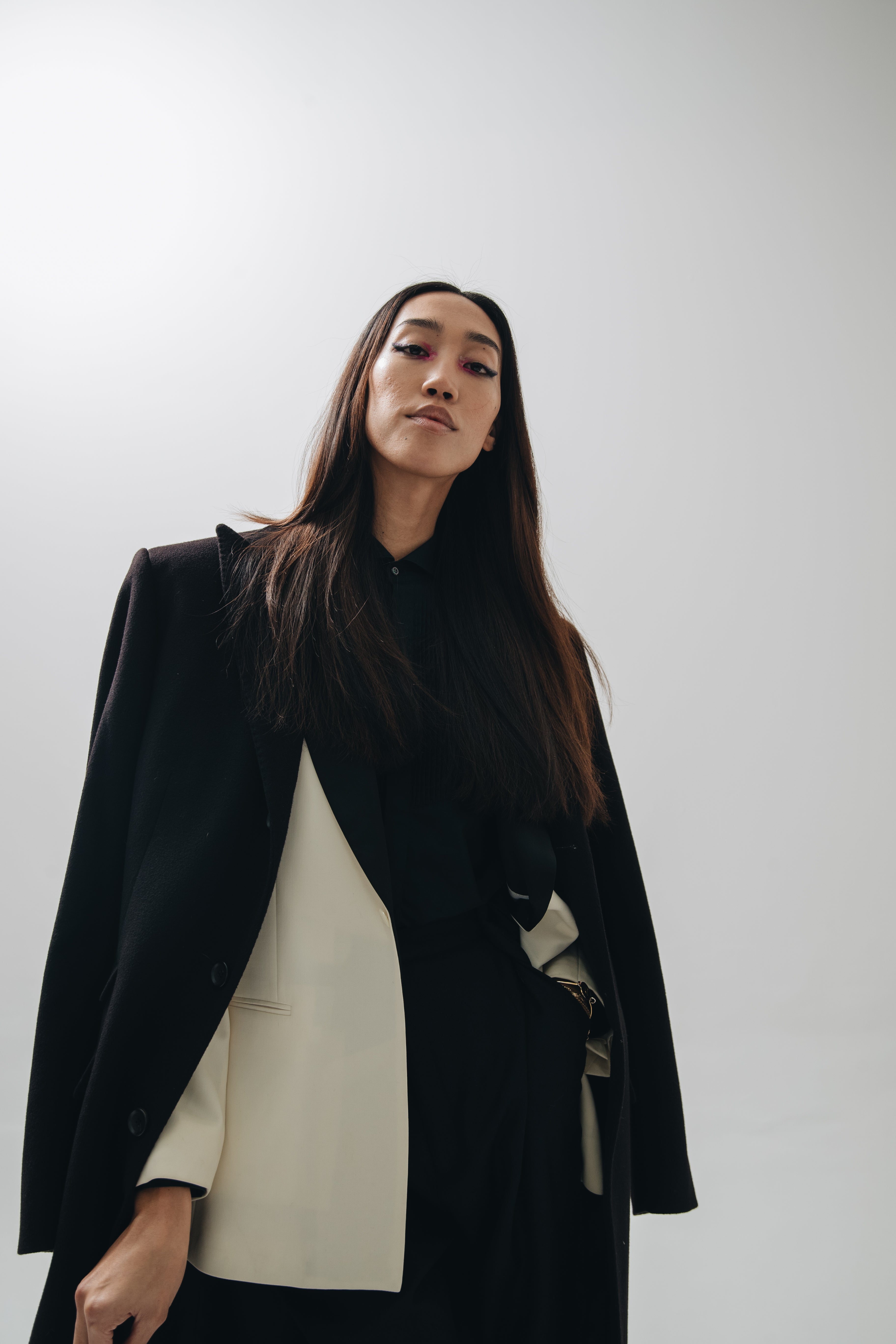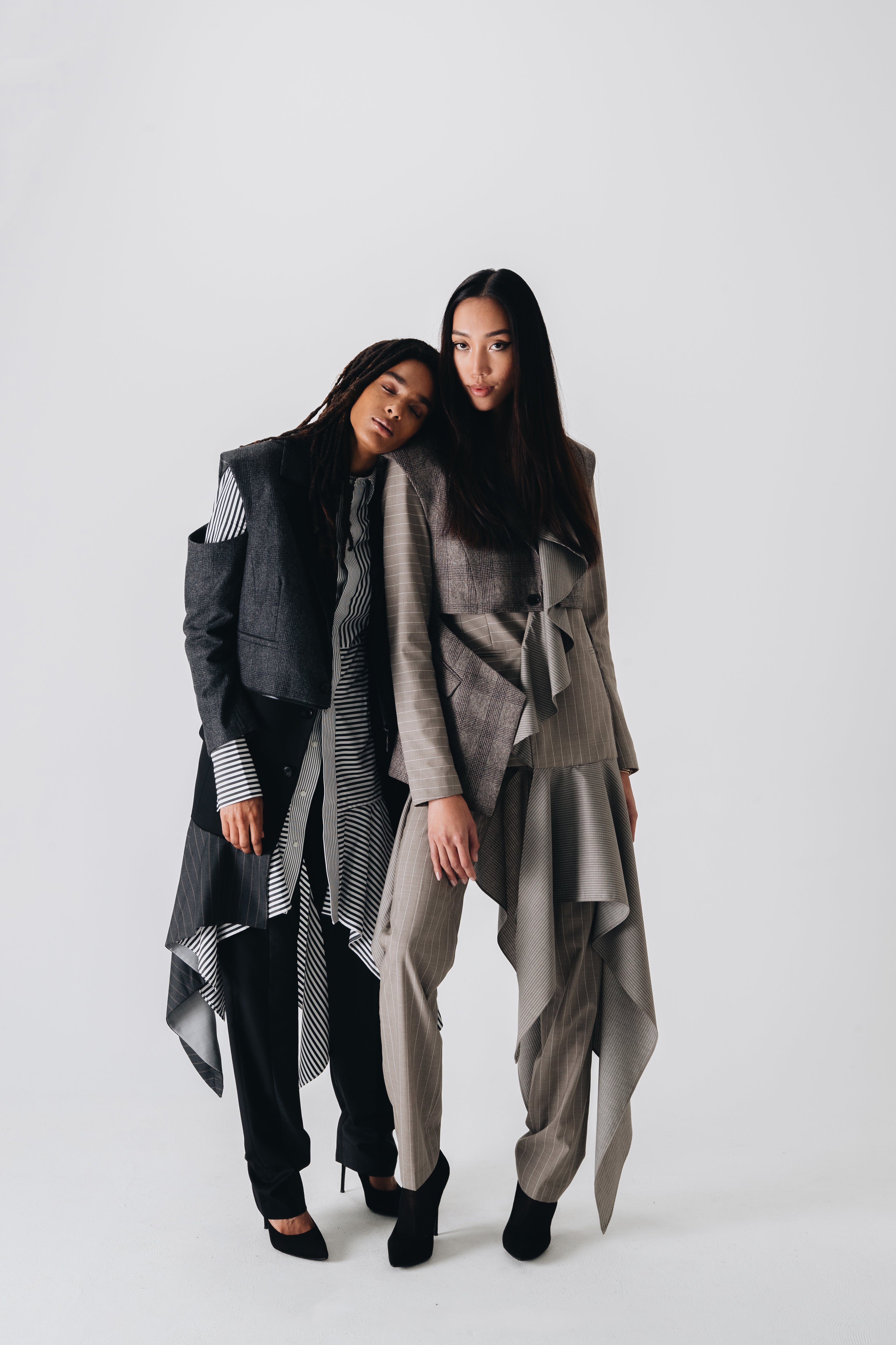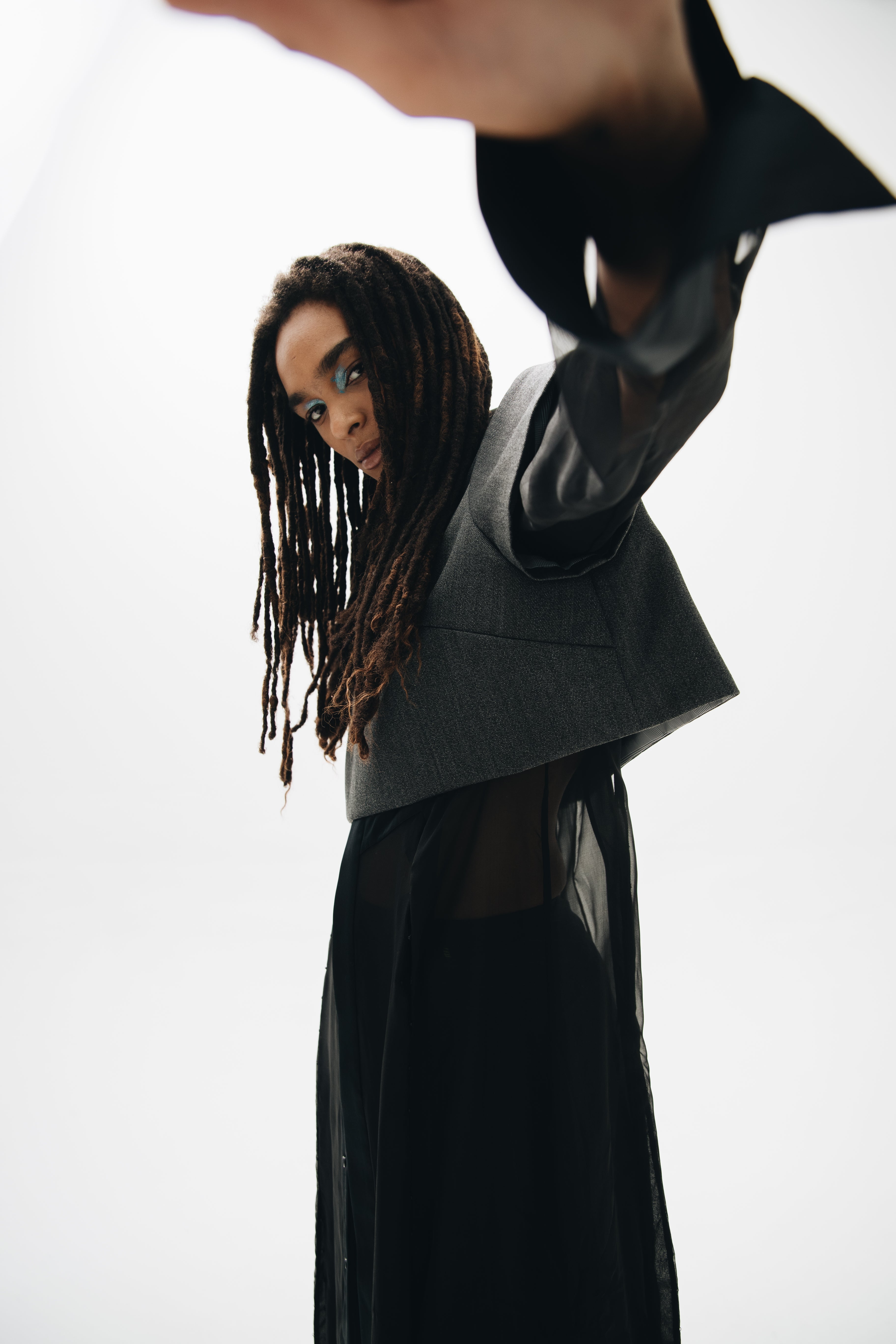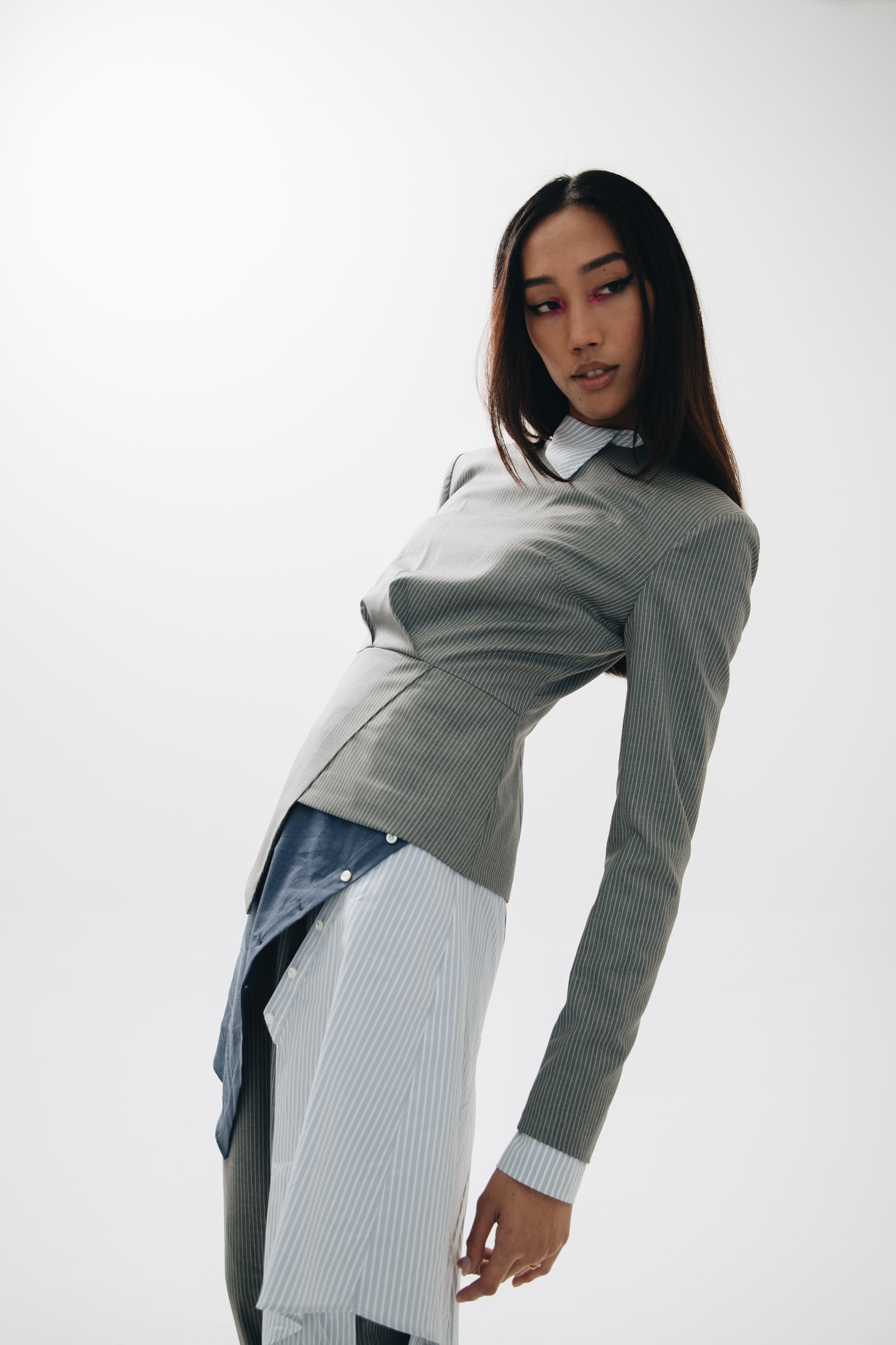 F.L.U.I.D. dismantles gender assumptions through maximalism and duality. Exaggerated suits, fluid jackets, architectural corsets, and evening gowns shift between opacity and vulnerability. Black, grey, blue—menswear fabrics meet silk. Garments become what the wearer demands. Vision over expectations.