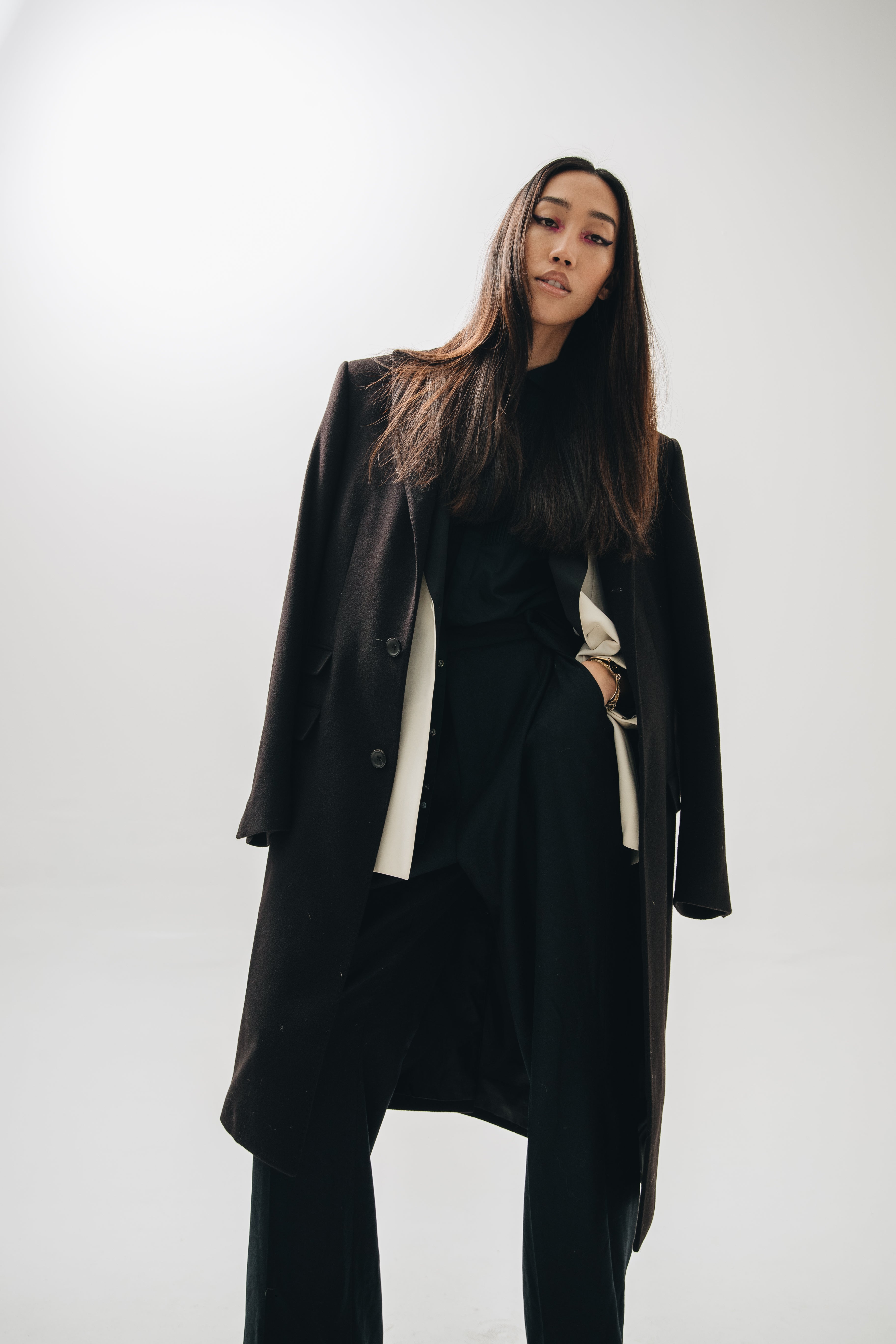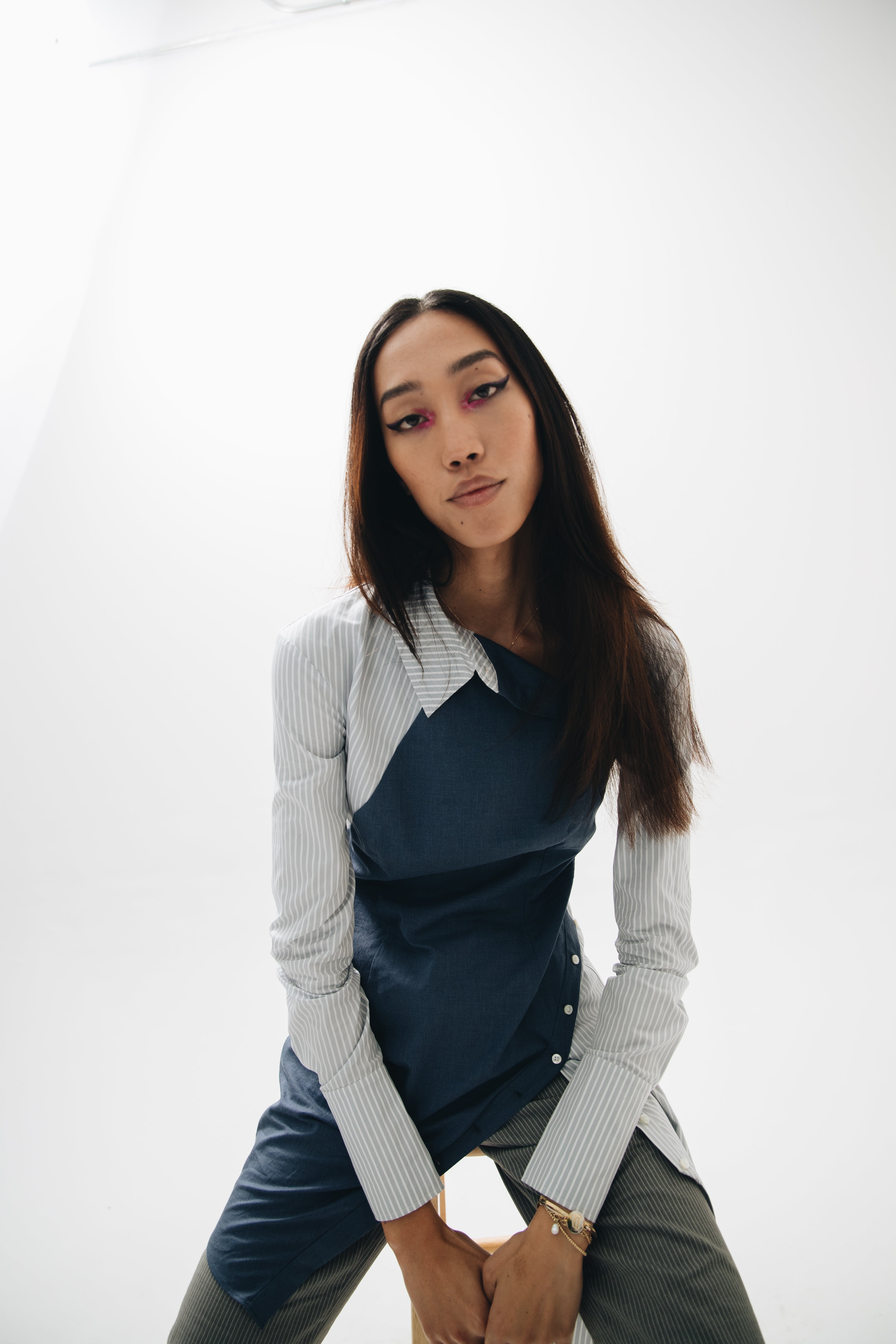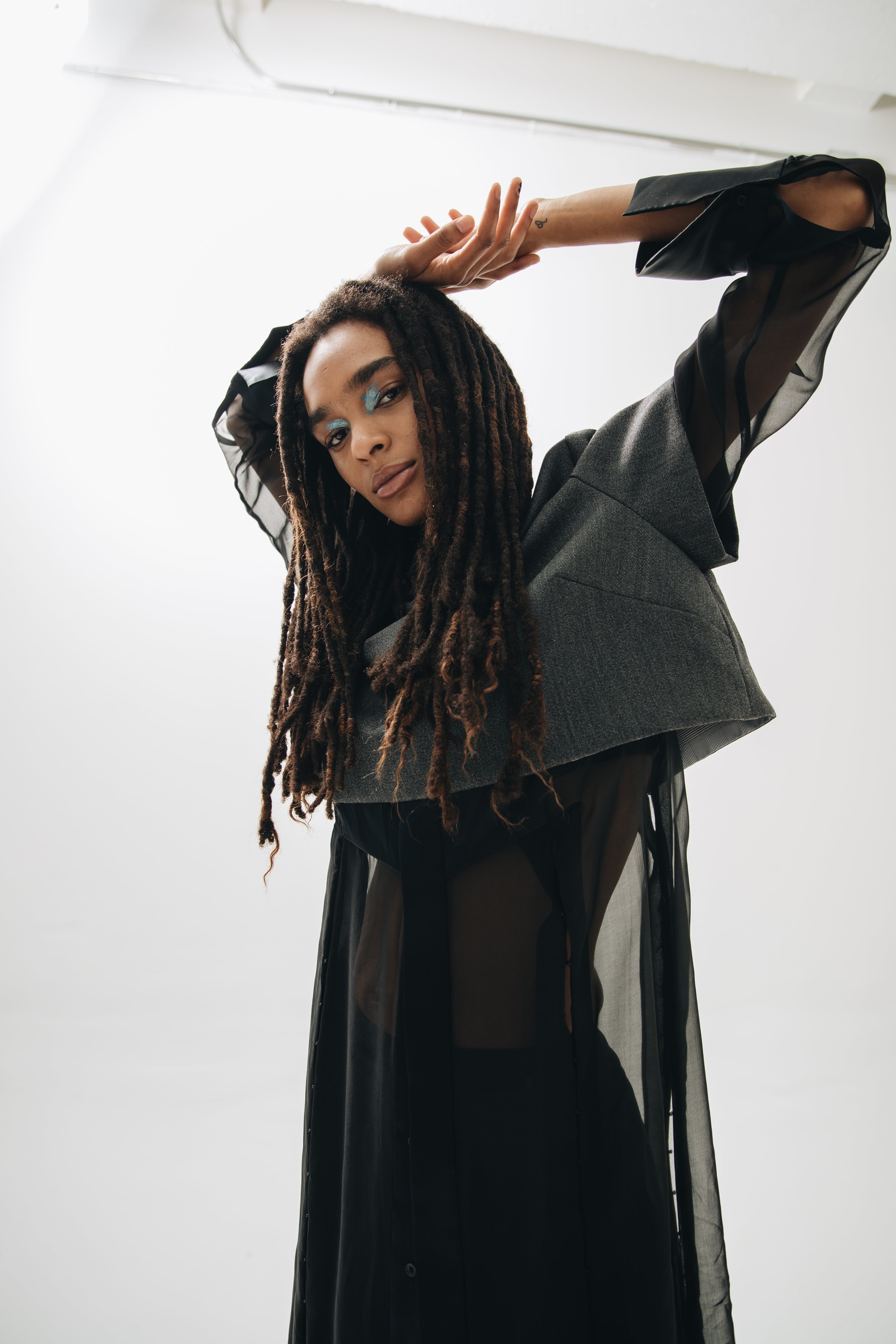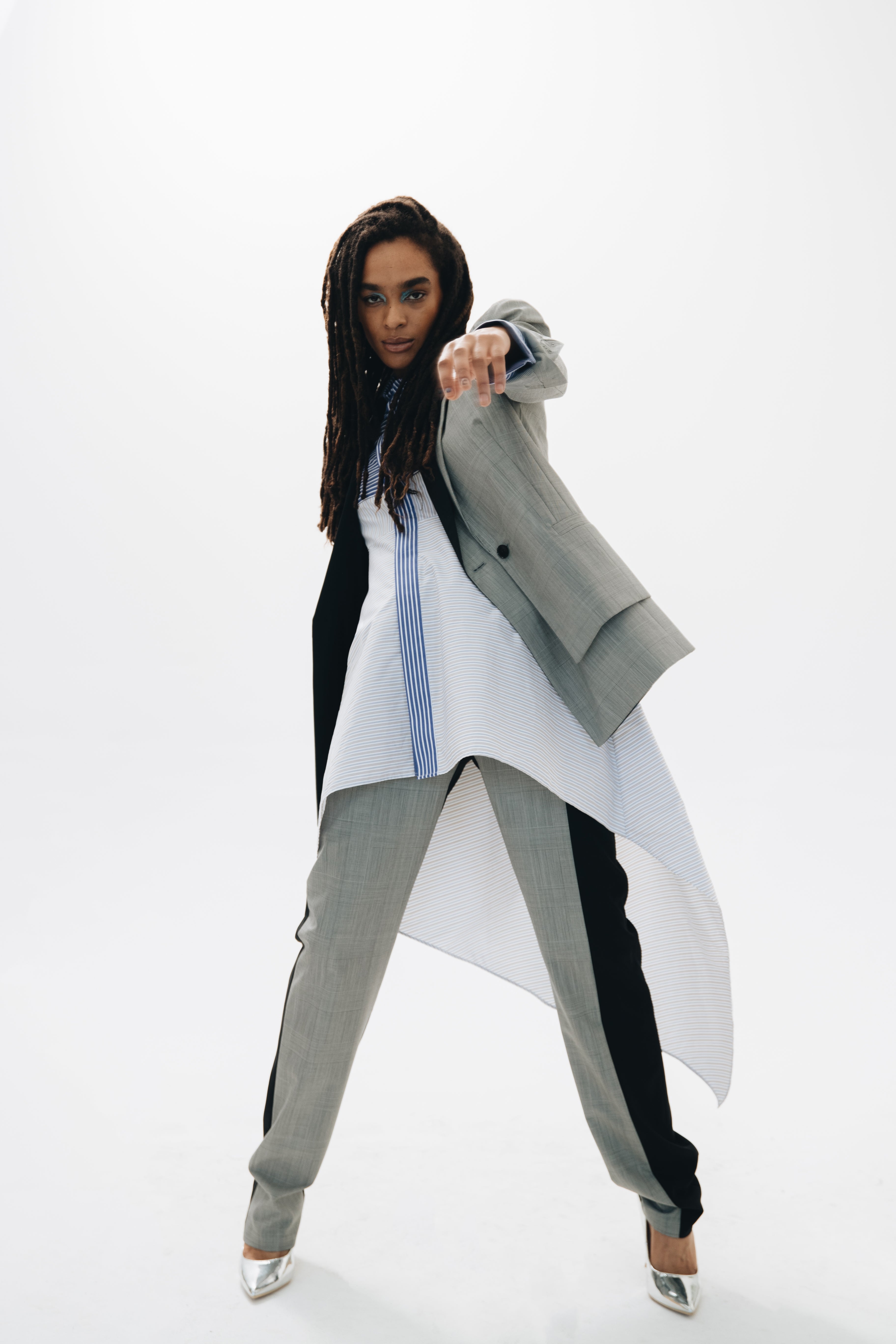 F.L.U.I.D. dismantles gender assumptions through maximalism and duality. Exaggerated suits, fluid jackets, architectural corsets, and evening gowns shift between opacity and vulnerability. Black, grey, blue—menswear fabrics meet silk. Garments become what the wearer demands. Vision over expectations.